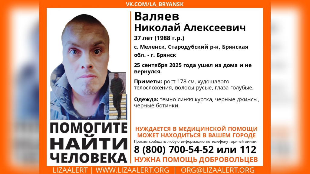 Отряд «ЛизаАлерт» объявил о поисках жителя Брянской области — Валяева Николая Алексеевича, 1988 года рождения. Мужчина проживает в селе Меленск Стародубского района.