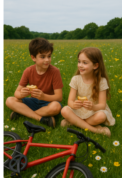 Они с хохотом падают в траву, спустило колесо и велосипед повело в сторону.