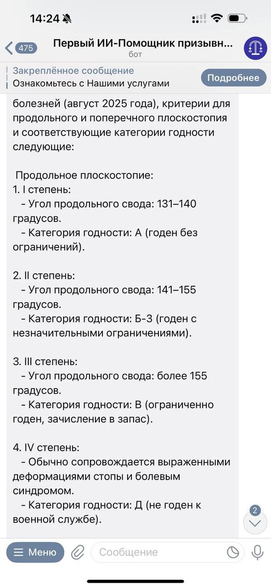 Если возникают вопросы при изучении Расписания болезней, задайте их ИИ-Помощнику призывника. Вот, например, как он разобрал вопрос из чата: какая степень плоскостопия к какой категории относится? После общего ответа можно запросить уточнения или попросить привести цитаты из Расписания болезней. А также отправить ему свои документы для анализа и определения категории годности.