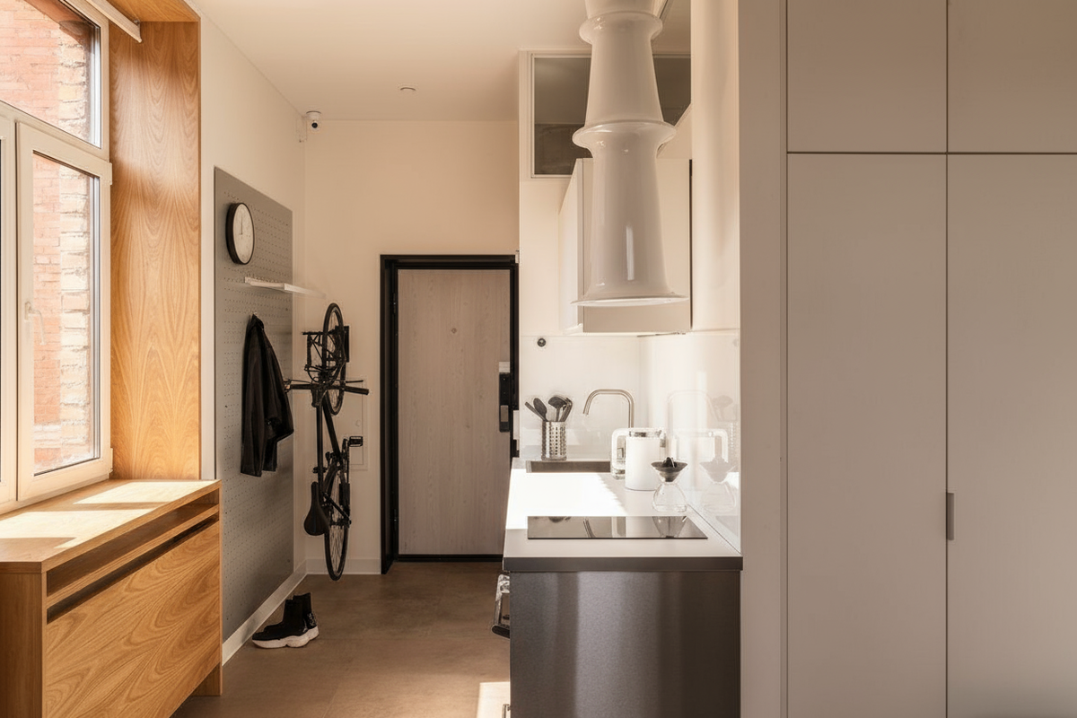 Хранить велосипед на лестничных площадках и в подъездах законом запрещено — и неудивительно: это небезопасно и неудобно. Замок легко могут срезать, да и сам велосипед рискует пострадать. А вот найти место для него даже в небольшой квартире вполне реально — вариантов больше, чем кажется. Самое простое решение — поставить велосипед в прихожей. Удобно, что он всегда под рукой: взял и поехал. Правда, будьте готовы к песку на полу и тому, что техника может мешать проходу. Поэтому такой вариант подходит только для достаточно просторных прихожих. Чтобы уборка не стала проблемой, лучше использовать для отделки стены в зоне хранения плитку или другой легко моющийся материал. Если места на полу не хватает, попробуйте подвесное хранение. На стену в прихожей или даже в спальне можно закрепить специальные держатели или кронштейны. В последнем случае велосипед может даже стать частью интерьера и заменить собой картину или постер. Есть еще вариант потолочного хранения — особенно для квартир с высоким