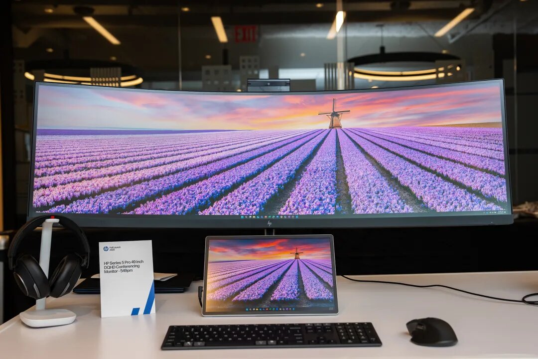 HP представила 49-дюймовый монитор с выдвижной камерой и режимом «три экрана» для офиса