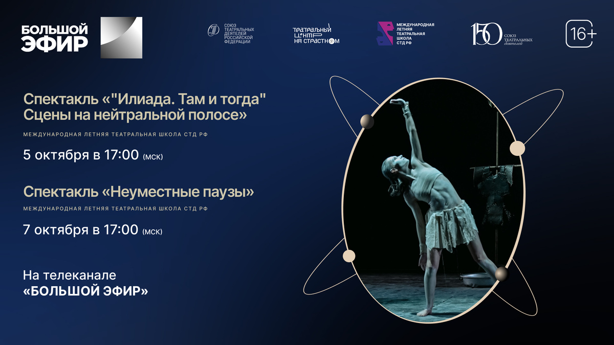 В эфире телеканала «Большой эфир» состоятся премьеры телеверсий спектаклей «Илиада. Там и тогда. Сцены на нейтральной полосе» и «Неуместные паузы». Обе постановки созданы в рамках Международной летней театральной школы Союза театральных деятелей России, проведенной этим летом. Показ «Илиады» запланирован на 5 октября в 17:00. Современная постановка сфокусирована на человеческих переживаниях войны — о преодолении трудностей и горечи расставания, о любви и смерти, о верности и предательстве. Художественным руководителем лаборатории, режиссером и сценографом спектакля выступил Искандер Сакаев, а драматургом — Анна Ерошина. Масштабный телеспектакль состоит из 12 эпизодов разных режиссеров и эпилога. В пластической партитуре спектакля присутствуют элементы биомеханических этюдов Вс. Э. Мейерхольда. 7 октября в 17:00 состоится показ танцевального спектакля «Неуместные паузы», который объединяет выразительные средства современного танца, физического театра и перформанса. В основе спектакля —
