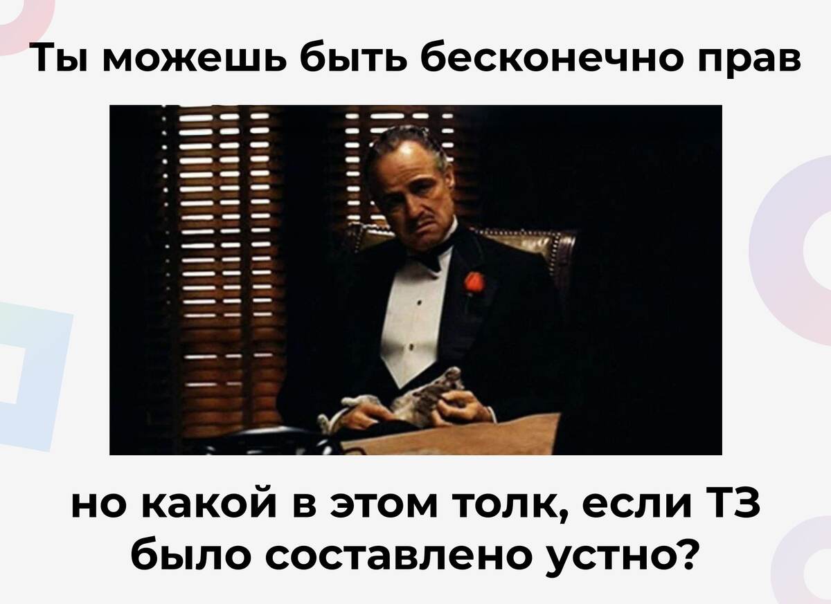 Никто и никогда вам не подсчитает, сколько на самом деле стоит устное ТЗ – сюда надо закладывать не только прямые трудозатраты на переделку, но и опасные подводные камни такого подхода: демотивация команды, сорванные дедлайны, испорченные отношения с коллегами и клиентами, растущее напряжение.