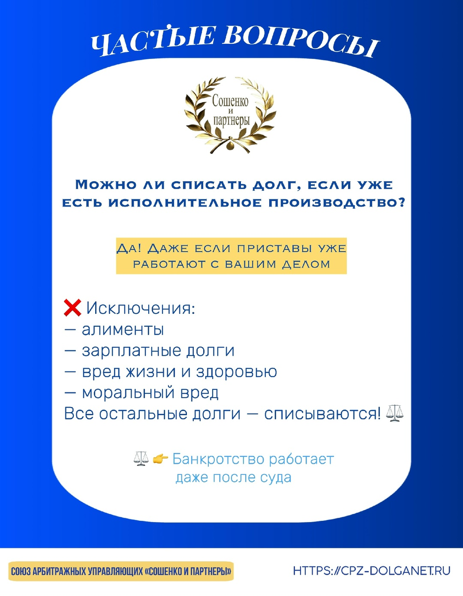 • Моральный вред Все остальные долги, даже те, что подтверждены судебным решением, могут быть списаны через процедуру банкротства. Миф о том, что «судебные долги не списываются» — неверный. Закон №127-ФЗ о банкротстве прямо предусматривает списание таких обязательств. Если ваши долги уже у приставов — это не приговор. Банкротство даёт шанс начать жизнь заново без долгового груза. тел: 89054870729 адрес: РО г. Шахты, пер. Красный Шахтер, 78 "Б", 3 эт, 5 оф ВК: https://vk.com/souz2018