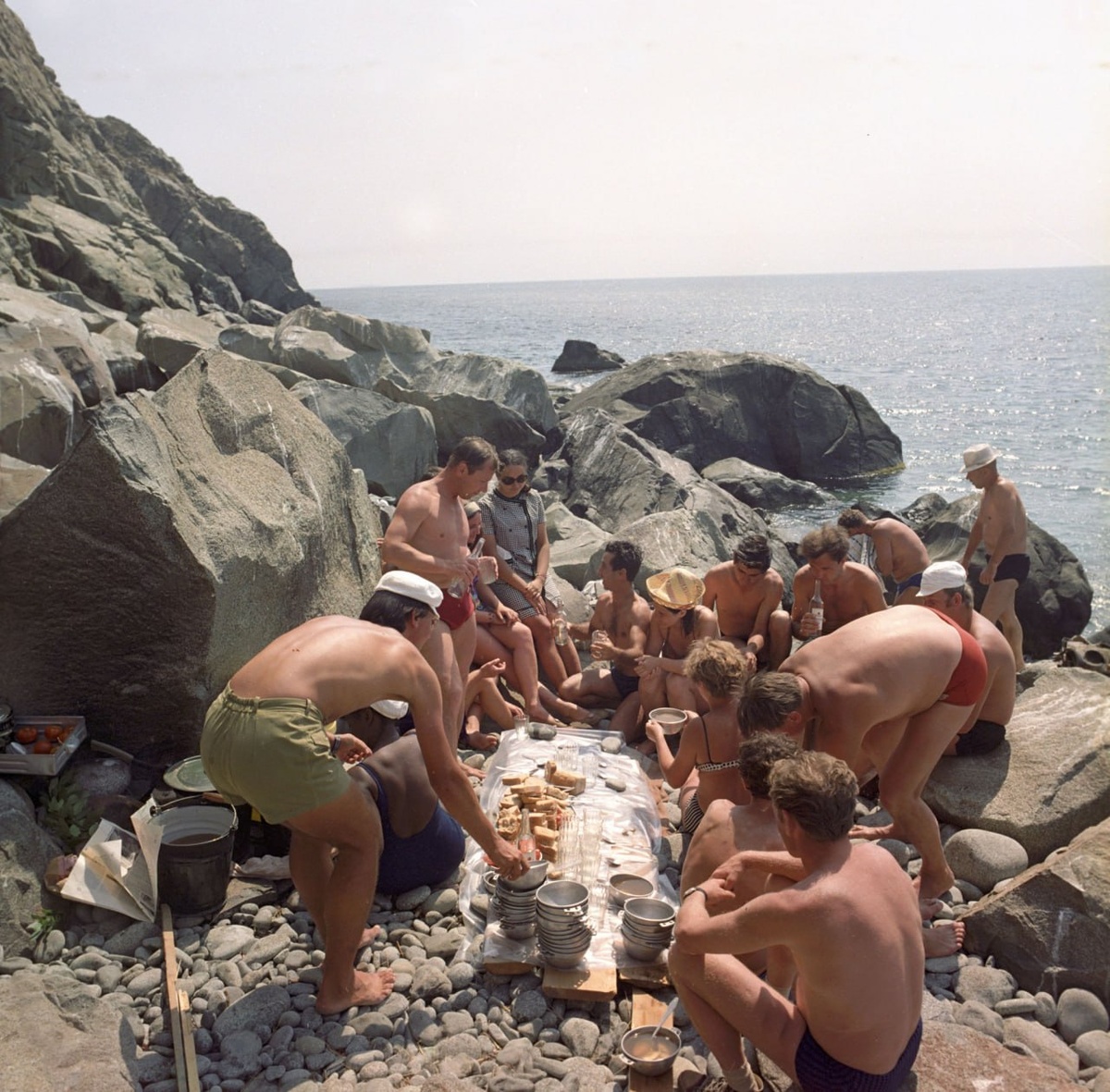 Рыболовы отдыхают на берегу Черного моря. 1971 год Автор фото: Вильфрид Глиенке (ГДР). Интересный набор посуды - алюминиевые миски. #Ялта #ретро #море #отдых #Глиенке