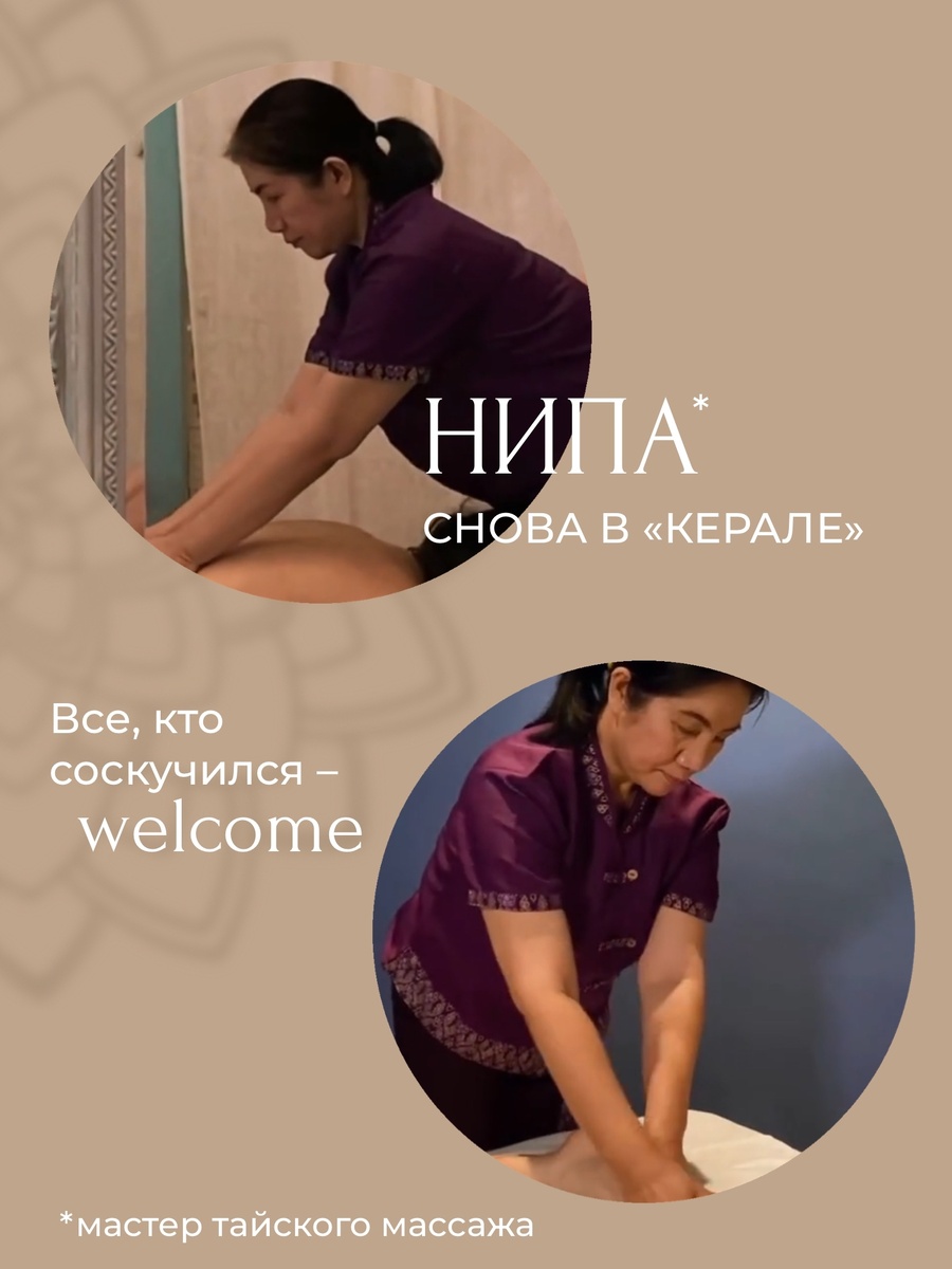 В «Керале» вновь открывает приём мастер, которого многие клиенты давно ждали, — Нипа, специалист тайского массажа с многолетним опытом работы в лучших спа-центрах Таиланда и за рубежом. За годы практики Нипа отточила мастерство до совершенства: её руки чувствуют малейшее напряжение, а точность движений позволяет быстро и эффективно устранить недомогания. Она умеет сочетать традиционные техники с индивидуальным подходом к каждому клиенту, подбирая именно ту комбинацию приёмов, которая подходит вашему телу. Эту практику нередко называют «ленивой йогой». И это не случайно: во время сеанса мастер с помощью своих рук, локтей, коленей и стоп мягко растягивает тело клиента, словно вводя его в череду асан, напоминающих йогические. При этом применяются элементы акупрессуры и проработка энергетических линий. Тайский массаж возник более 2500 лет назад в монастырях и изначально был не просто телесной практикой, а способом заботы о здоровье монахов и их учеников. Сочетание растяжек, работы с точка