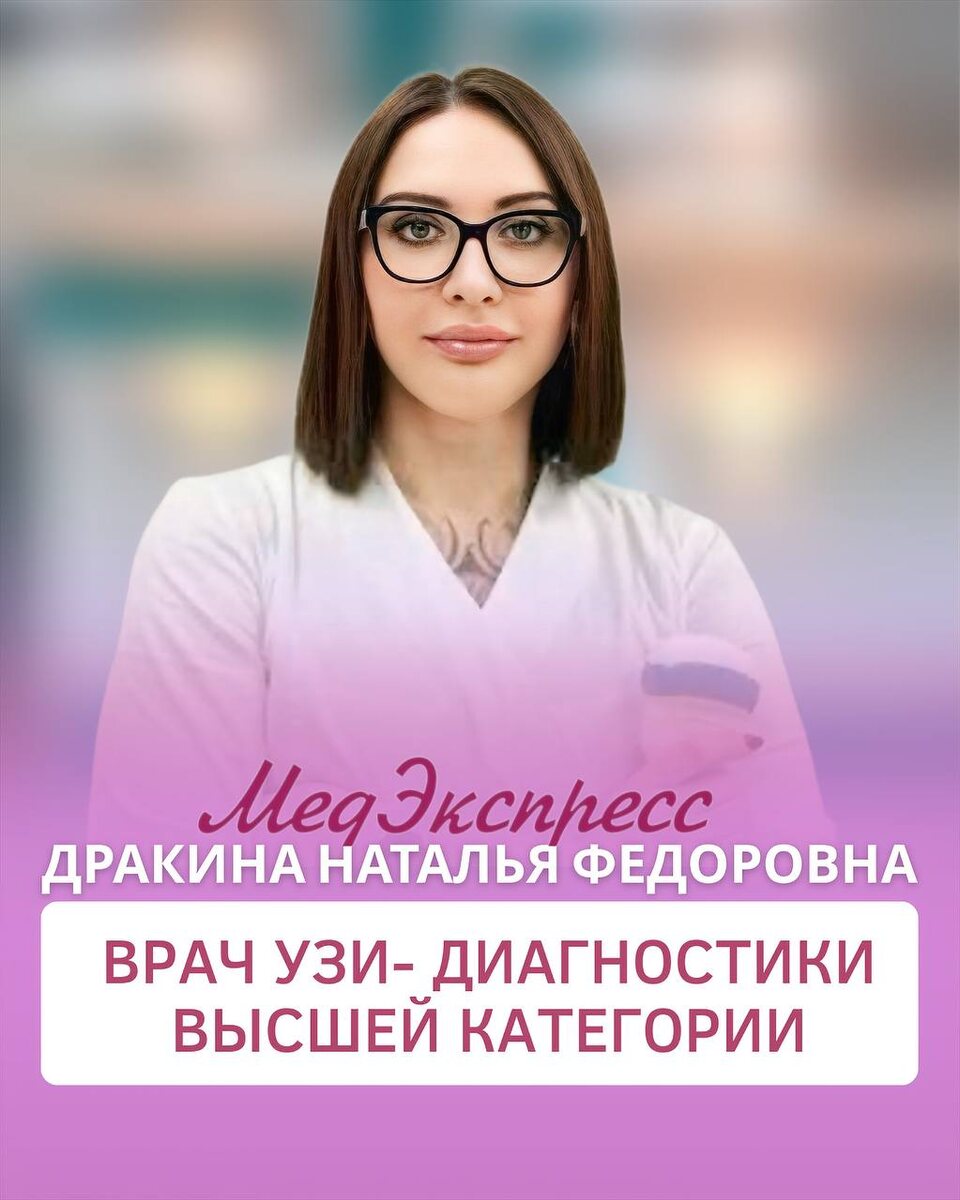 Беспокоят неопределенные симптомы? Нужен плановый осмотр? Точность диагностики — это 90% успешного лечения! С радостью сообщаем, что в клинике «МедЭкспресс» начинает прием врач ультразвуковой диагностики высшей категории — Дракина Наталья Федоровна! Наталья Федоровна — это: - Опытный специалист с высшей категорией -Точная и внимательная диагностика -Современное оборудование экспертного класса Теперь вы можете доверить свое здоровье одному из лучших диагностов города! Записывайтесь на УЗИ уже сегодня! Брянск, ул. Фокина, 67, 3 этаж +7 (4832) 777-514 Брянск, ул. Дуки, 62 +7 (4832) 77-25-29