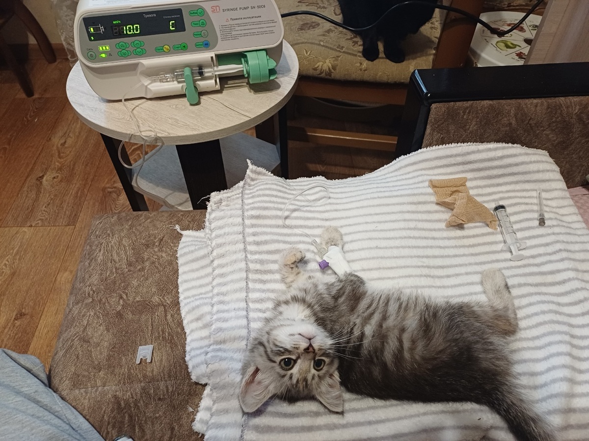 Эту малышку, названную Тиффани, забрали из подъезда, вместе с мамой, куда их выбросили прежние хозяева. Котенок тогда только-только открыл глаза и на передержке нащлось место для пушистого семейства. Вроде, все должно было бы быть хорошо, но Тиффани заболела. Куратор понесла ее в клинику, где питомице назначили лечение и отправили домой. Куратор приняла решение, что будет лечить ее сама, поэтому, забрала к себе, не стала возвращать на передержку. Сначала, котенку становилось лучше, она начала играть, бегать...но через несколько дней произошло обострение болезни и они с куратором срочно уехали в клинику, где малышку срочно положили под капельницу. Температура на тот момент опустилась до 36.2. Крошка была очень слаба. Состояние питомицы стабилизировали и отпустили домой. У куратора есиь свой инфузомат, поэтому, необходимости оставлять котенка в стационаре ветеринары не увидели. Организм Тиффани хорошо отвечал на лечение,и вскоре она уже нападала на своих сородичей. Играя, разумеется. :)