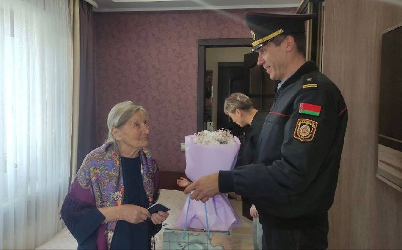 В сентябре ей исполнилось 100 лет. Адресовали женщине тёплые слова поздравлений, вручили цветы и подарки в Международный день пожилых людей начальник отделения по гражданству и миграции ГОВД майор милиции Родион Тишкевич и инспектор отделения Татьяна Бурец.