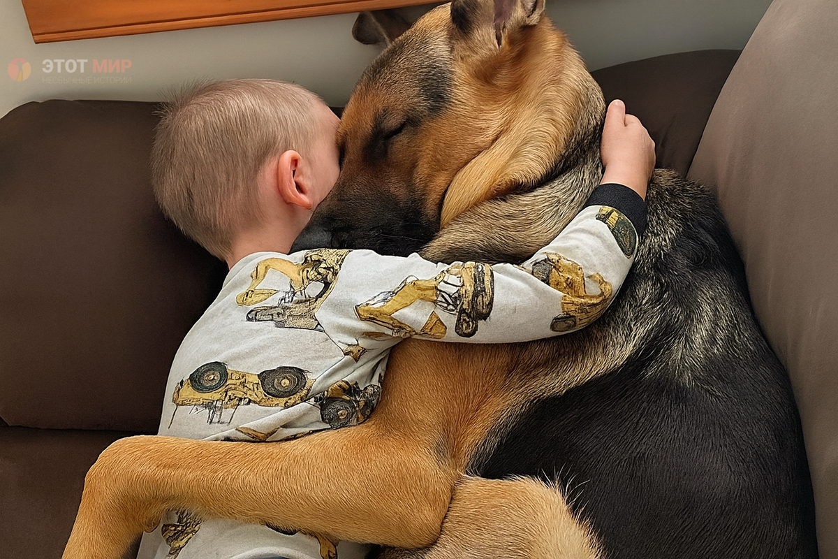 Трёхлетний мальчик даже не шелохнулся. Он только сильнее прижался к огромномой немецкой овчарке, уткнувшись лицом в густую шерсть. Серые пижамные штанишки с жёлтыми машинками сбились на коленях, маленькие руки намертво обвили шею собаки.