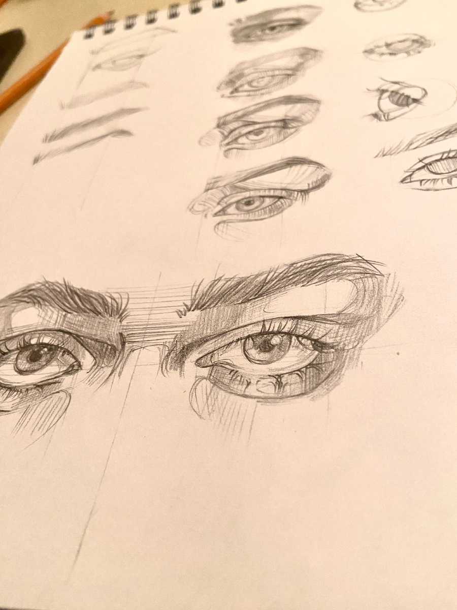 Эту маленькую книжку по портретам я приобрела у блогера Humid Peach. Мне очень нравятся ее портреты, хотя конечно мне далеко до них. И иногда это даже демотивирует. Но в основном вдохновляет. В этой книге очень просто описано, как рисовать портреты. Так, наверное, написал бы любой человек «для себя». Здесь показаны техники и приемы, последовательно изложен материал. Хотя книжка совсем маленькая, примеров и текста немного, но зато все очень понятно. Именно по ней я училась рисовать голову Гудона. Я прошла уже половину, и к своему дню рождения хотела закончить изучение. Осталось всего две недели. На этой неделе я успела пройти тему - о глазах. Глаза - это зеркало души, самая красивая часть лица человека. Поэтому, наверное, этой теме посвящено достаточно много места в книге. Я рисовала по утрам и по вечерам понемногу, то, что нарисовано в книге. То, что можно использовать , как упражнения, повторяя. И вот, что из этого вышло. До этого я рисовала много глаз, много портретов. Были глаза сл