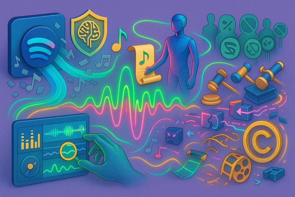 ▫️ Что произошло. Главная новость месяца — Spotify удалил 75 миллионов «спам-треков» (https://t.me/gensound/867)и анонсировал новые, более жёсткие правила для ИИ-контента, включая обязательную маркировку и запрет на клонирование голосов. Эти действия подкреплены статистикой от Deezer, где доля ИИ-треков в ежедневных загрузках достигла почти 30% (https://t.me/gensound/850). В ответ мейджоры UMG и Sony начали внедрять технологию «нейронных отпечатков» (https://t.me/gensound/867) для более точного отслеживания своего контента.