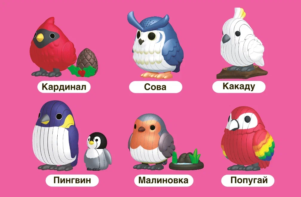 Серия "Птицы" - знакомит с самыми причудливыми и забавными пернатыми, которые узнаваемы и любимы среди детей. Познакомься с самой нарядной и голосистой птицей — огненным кардиналом, который приносит с собой праздник даже в снежный день! Собери не только его, но и уютную сосновую шишку — идеальный аксессуар для игр и украшения своей коллекции. Твой зимний друг готов порхать по ванне, устроиться на ветке новогодней ёлки или украсить собой полку. Не тонет, не боится воды и дарит настроение круглый год! Двойная сборка (птица + шишка) — больше удовольствия и творчества. Мудрая сова готова составить компанию вашему ребёнку где угодно: в долгой дороге на поезде, во время перелёта, в очереди или в гостях. Собранная сова станет верным другом — поместится на плече как настоящий питомец, украсит полку в новом месте или составит компанию во время купания. Познакомься с белоснежным красавцем и харизматичным артистом — какаду, который обожает быть в центре внимания! Его яркий хохолок и любопытный вз