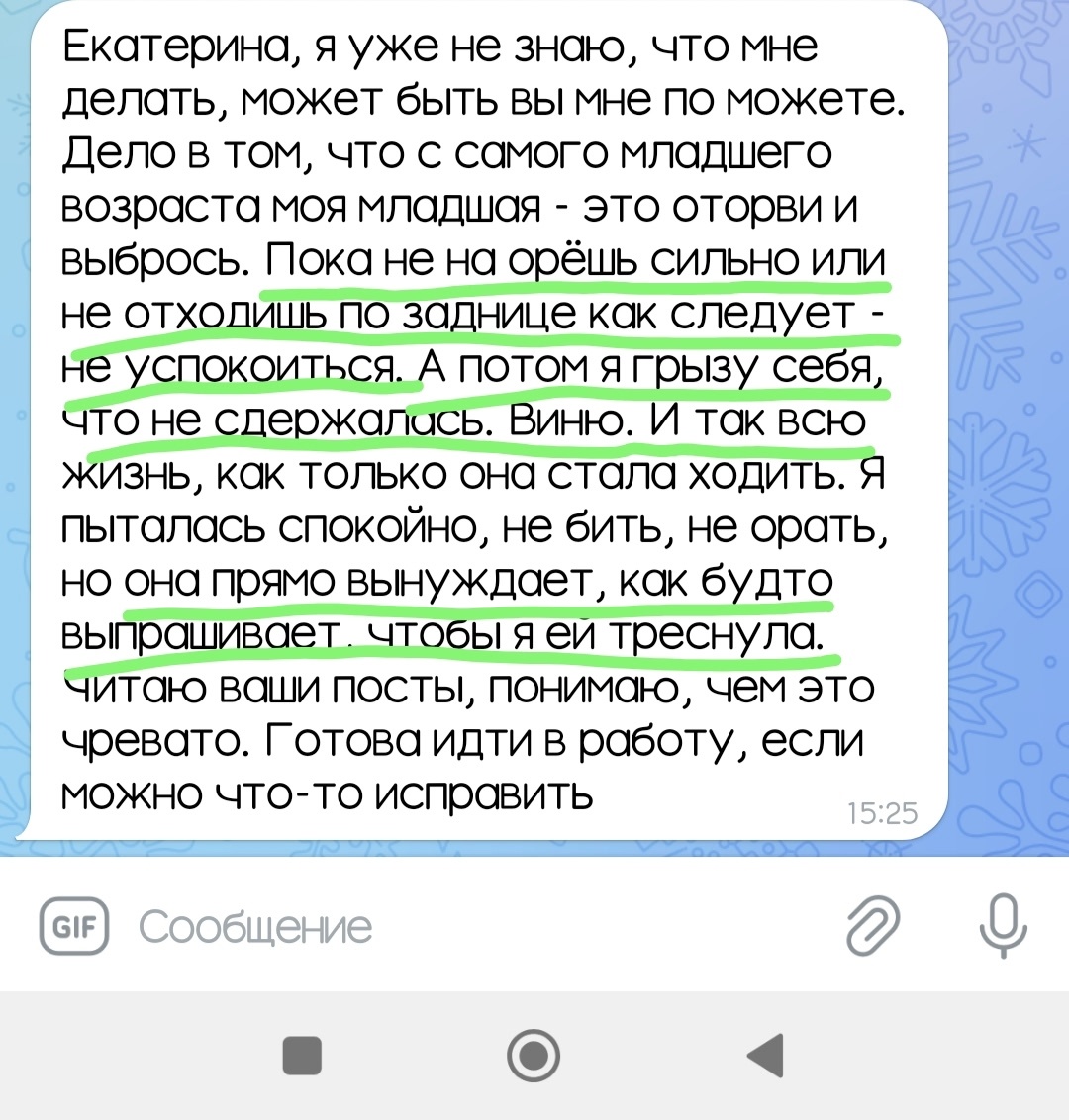 ОНА ПРЯМО ВЫНУЖДАЕТ, ЧТОБЫ Я ЕЙ ТРЕСНУЛА Когда многие готовятся стать родителями, то прикидывают какие стратегии воспитания у них будут. Многи сразу говорят, что шлепки, пинки, ремень и прочее физическое насилие - это табу и никогда такие методы в воспитании своих детей они использовать не будут. Но многие в последствие отказываются от этой стратегии, потому что в какой-то момент времени становятся бес сильными, выгорают и ....срываются. Я не буду осуждать. Я пишу это сейчас с другой целью - помочь, показать выход, направить. Ко мне на диагностику пришла мама, которая имеет дочь 9 лет, которая так и вынуждает её ударить, наорать, применить к ней вы физическое насилие. После чего мать чувствует вину, но сдержаться уже не может. Выяснилось, что девочка с рождения очень активная, нервная система возбуждается мгновенно, а вот вернуться в спокойное состояние крайне трудно. Многим родителям с активными и легко возбудимыми детьми довольно сложно как морально, так и физически. Надо п