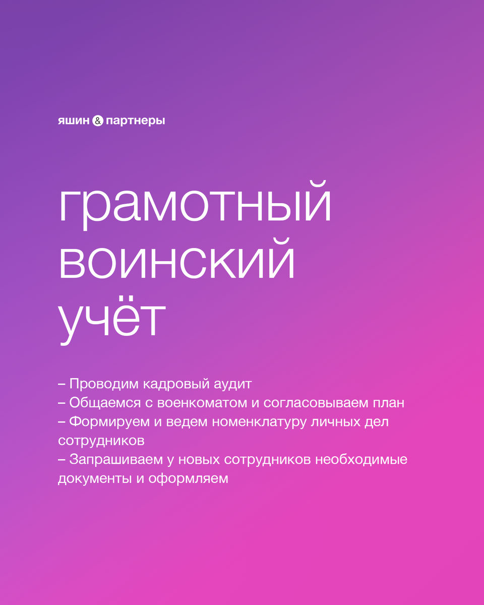 Самое время вспомнить про воинский учет в компании — тем более, что правила ведения сильно изменились. Передайте эту зону ответственности нам на аутсорсинг — и будьте уверены, что всё будет как положено Новшеств в этом году предостаточно. Новые формы, порядки бронирования, электронные уведомления, приостановка трудовых договоров... Но самое неприятное — увеличение штрафов за некоторые нарушения в 5-10 раз. Сумма штрафов может достигать 500 000 рублей на пустом месте. Мы в Яшин&Партнёры можем подхватить воинский учет на любом этапе и организовать процессы полностью без вашего участия. Если для вас актуально ведение воинского учета, оставляйте заявку на сайте