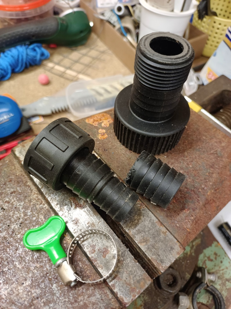 Раз 1" нам не подходит — сделаем переходник на 3/4. Просто отпиливаем от большой детали носик. И привинчиваем к нему переходник от садового фонтана. Теперь можно будет дистиллированной водой погонять систему автоматически. На нажимая на рычаг по 50мл вливая.