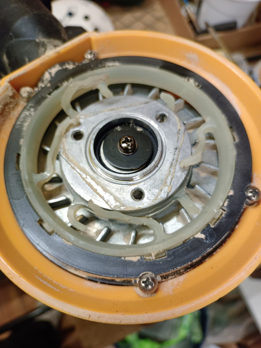У аккумуляторной эксцентриковой машинки смотрю диск не крутит. Разобрал. Какая-то сломанная пластиковая фигня. Выкинул. Закрутил обратно — работает. Шлифовать всегда что-то нужно. Что за деталь то была — потом разберёмся.