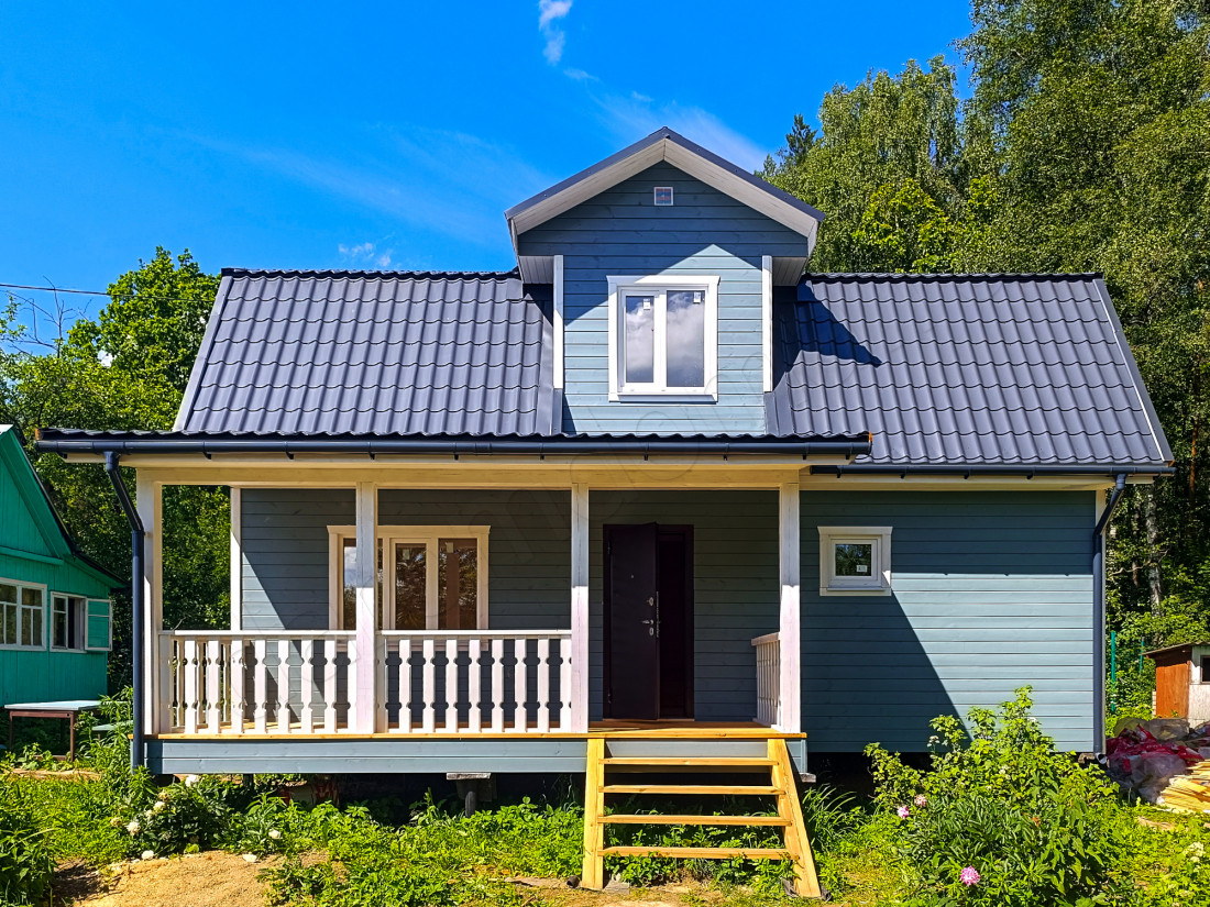 Дом предстоит построить в Тульской области. Строительство стартовало по графику, уже в конце мая на складах закипела работа. Скомплектованы необходимые строительные материалы, упакованы и загружены. Опытные плотники и материалы отправились в Медвенское сельское поселение. Завершена разгрузка – закипела работа. Установлена бытовка, собрано основание дома и тщательно обработано антисептиком. Для защиты от грызунов смонтирована металлическая сетка. Собран каркас строения, и установлены стропильные конструкции. Выполнено утепление и обшивка ограждающих конструкций, настелено кровельное покрытие. Установлены лестница, окна и двери. Выполнено оформление террасы и установлена водосточная система. На строительство и отделку каркасного дома 6х9 м с мансардой и дормером профессионалам потребовалось ровно четыре недели. Строительство завершено, теплый, практичный каркасный дом, ждет счастливых хозяев.