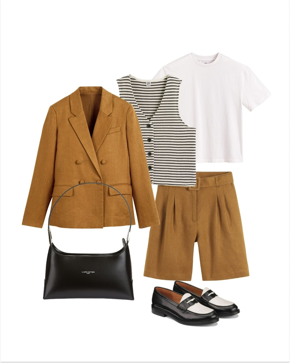 Нестандартный офисный образ, в котором сочетаются структура и летняя беззаботность. Льняной пиджак и шорты в оттенке карамели - элегантная альтернатива привычному костюму. Белая футболка и вязаный жилет с полоской добавляют текстуры и графики, а чёрные лоферы и сумка завершают образ в духе французского минимализма. Совет: если шорты - не ваш формат для работы, замените их на классические брюки в тон и добавьте акцентную бижутерию - получится не менее стильно.