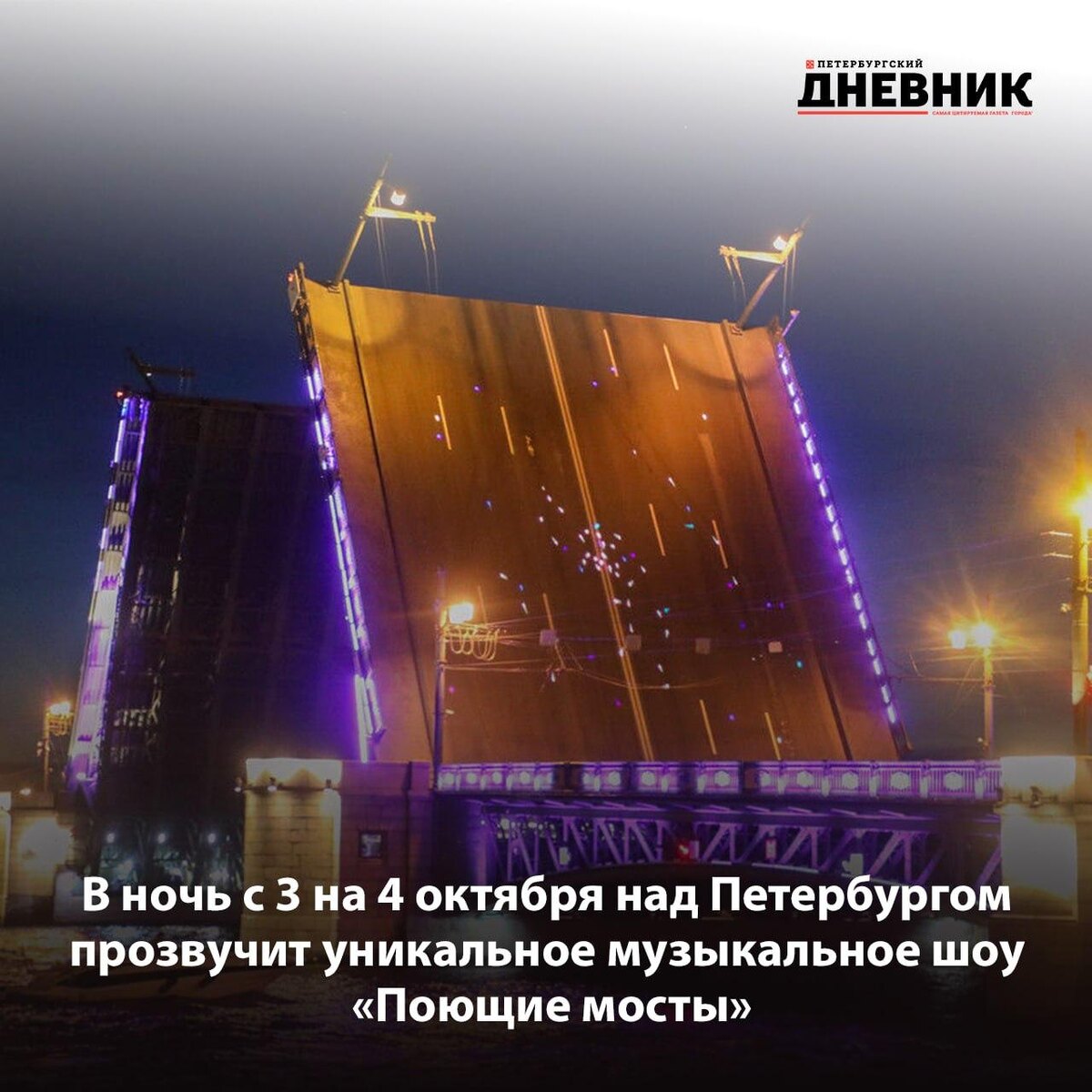 🎶 «Поющие мосты» зазвучат над Невой в юбилейный вечер Программа начнется в 1:10 по московскому времени с «Гимна Великому городу» из балета Рейнгольда Глиэра «Медный всадник», а затем петербуржцы и гости города услышат фрагменты вокального цикла Георгия Свиридова «Отчалившая Русь» на стихи Сергея Есенина. Прозвучит архивная запись, сделанная в Петербургской Капелле, – «О Родина, счастливый и неисходный час!» – в исполнении сводного хора четырех высших школ музыки Санкт-Петербурга под управлением лауреата премии правительства города в области культуры и искусства, заслуженного деятеля искусств России Сергея Екимова. Гости мероприятия услышат также еще одно произведение цикла – «Отвори мне, страж заоблачный...». Оно прозвучит в исполнении оперного певца Дмитрия Хворостовского и пианиста Михаила Аркадьева. Завершит шоу «Вальс» из музыкальных иллюстраций к повести А. С. Пушкина «Метель» в исполнении Большого симфонического оркестра под управлением народного артиста СССР Владимира Федосее