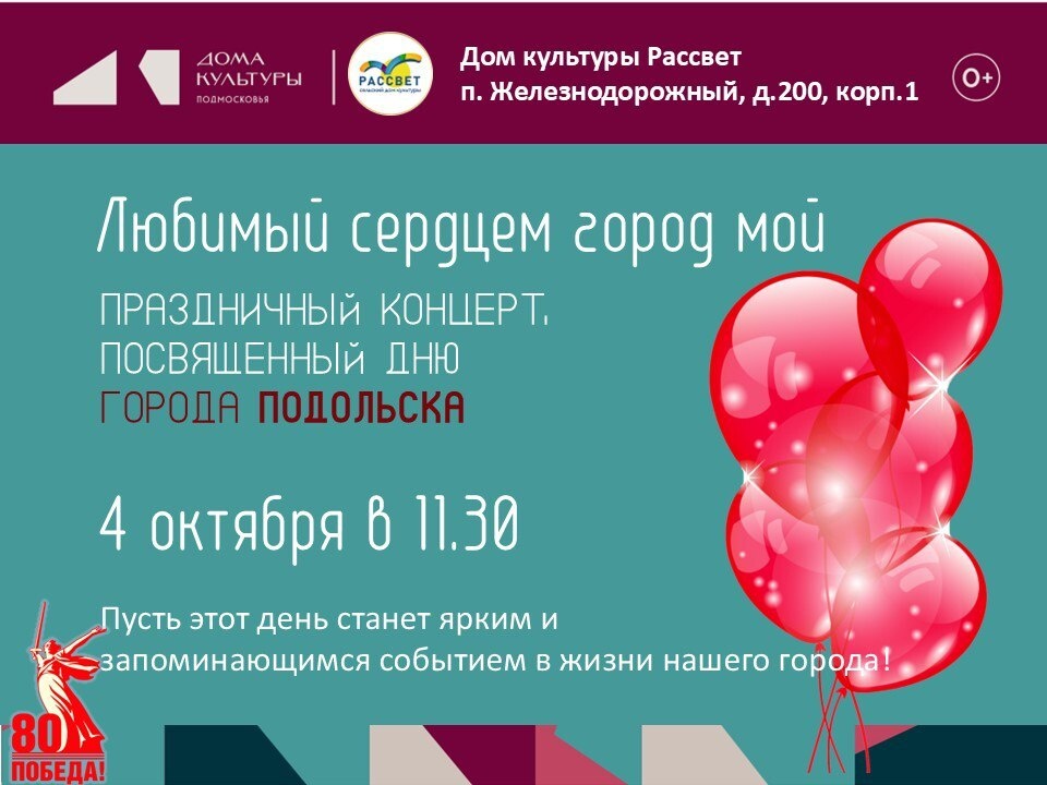 ✨ Праздничный концерт, посвященный Дню города Подольска в п. Железнодорожный г.о. Подольск Приглашаем на концерт «Любимый сердцем город мой»♥️ Для Вас яркие номера, подготовленные коллективами Дома культуры💃 🏢 ДК "Рассвет" 📍г.о. Подольск, п. Железнодорожный, ул. Б. Серпуховская, 200 🚫 Возраст: 0+ 📆 04.10.2025 🕒 11:30 💰 Вход свободный❗️ ⭐Поддержать канал голосом 💰 Вакансия - курьер в Подольске ✅ Мероприятия Подольск https://dzen.ru/id/66ed500f7b5671493eca3fd6 http://vk.com/podolsk_events http://dzen.ru/podolsk_events