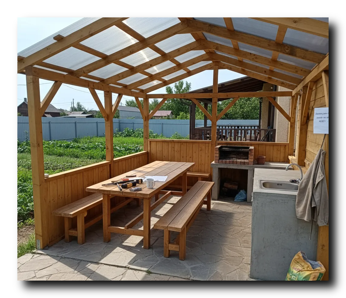 Это уже более солидное сооружение, с стенами, возможно, даже с остеклением. Такая конструкция защитит и от дождя, и от назойливых насекомых.