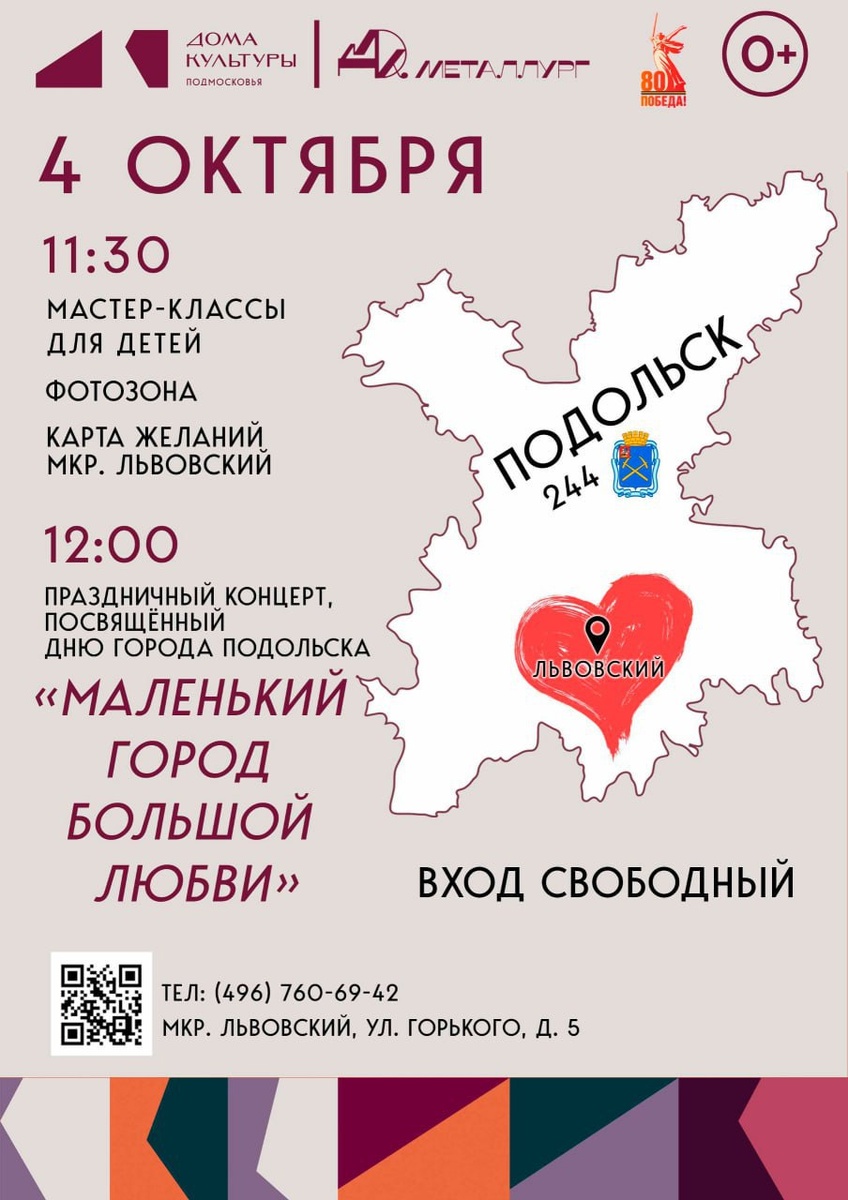 ✨ Концерт, посвящённый Дню города в мкр-не Львовский Дорогие друзья♥️ Будем рады видеть вас на праздничном концерте в которым участвуют коллективы Дома культуры 💃 🚫 Возраст: 0+ 📆 04.10.2025 🕒 12:00 🏢 Дом культуры «Металлург» 📍 г.о. Подольск, мкр-н Львовский, ул. Горького, д. 5 💰 Вход свободный❗️ ⭐Поддержать канал голосом 💰 Вакансия - курьер в Подольске ✅ Мероприятия Подольск https://dzen.ru/id/66ed500f7b5671493eca3fd6 http://vk.com/podolsk_events http://dzen.ru/podolsk_events