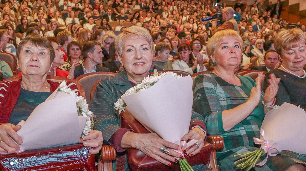 На сцене концертного зала чествовали педагогов, воспитателей, сотрудников дошкольных учреждений и работников дополнительного образования. В областном центре, по данным администрации, работают более 3300 педагогов.