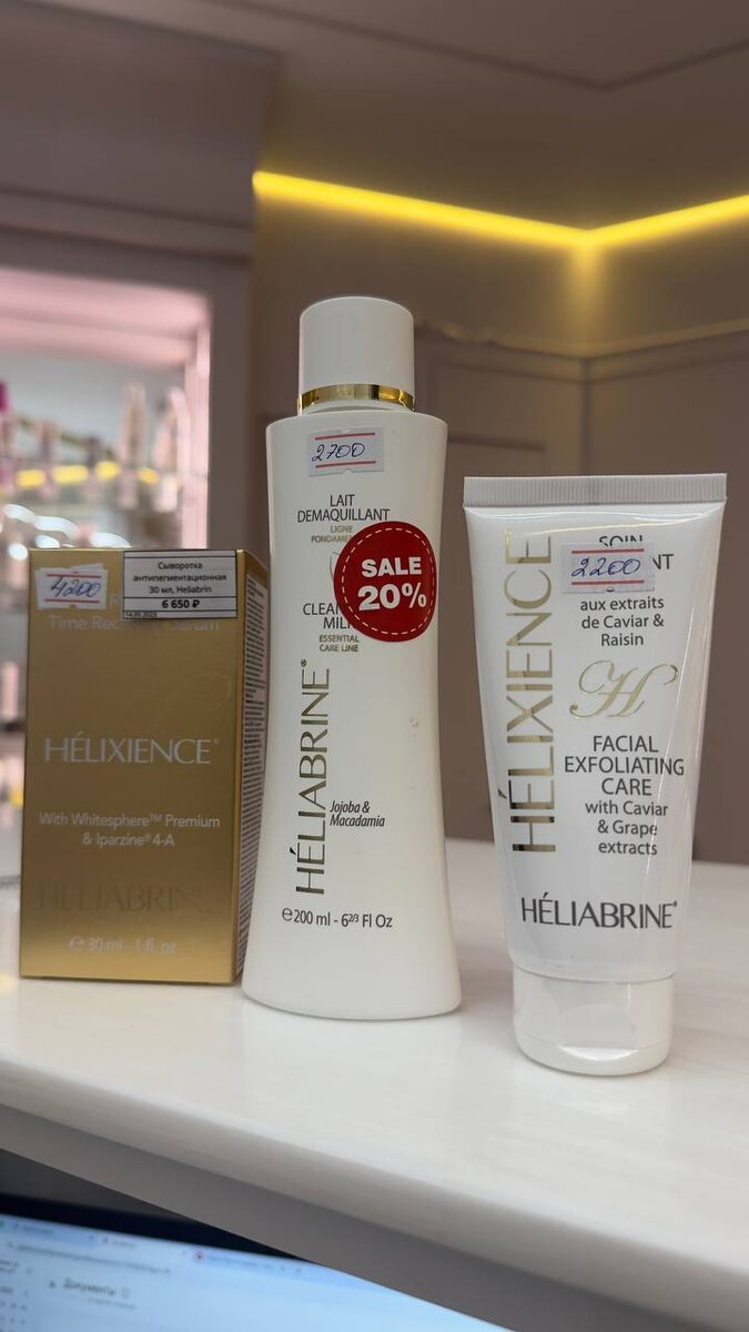 Последние 3 позиции Heliabrine🔥🔥🔥 Скидка более 40% Сыворотка антипигмент Сыворотка Helixience от известного бренда Heliabrine (Монако) станет настоящим спасением для обладательниц пигментированной кожи! Этот инновационный продукт обладает успехами: он эффективно борется с уже существующими пигментными пятнами, что приводит к появлению новых, делая кожу гладкой и сияющей. Благодаря своей формуле, сыворотка использует последствия усталости и негативных последствий городской жизни, а также защищает вашу красоту от вредного ультрафиолетового излучения. 💦💦💦💦 Очищающее молочко жожоба и макадамия Эффективное и нежное очищение кожи лица от макияжа и загрязнений. Молочко насыщено маслами Жожоба и Макадамии, которые делают кожу мягкой и сияющей. Очень мягкое, это молочко подходит для всех типов кожи. 💧💧💧 Крем эксфолиант с экстрактом черной икры 🕶️ Крем-эксфолиант с экстрактом чёрной икры Этот нежный отшелушивающий уход с экстрактами икры и винограда, богатый витаминами А,В,D и п