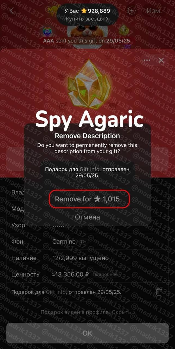 💬Удаление комментария с подарка! Если цена улучшения + цена самого подарка больше 5 000⭐️ - то цена удаления комментария равна 10% от начальной стоимости! 🎁Cake - 500⭐️ 🎁Spy Agaric - 1 015⭐️ Если цена улучшения + цена самого подарка ниже 5 000⭐️ - то стоимость удаления 500⭐️ без исключений Источник — @madrik1337