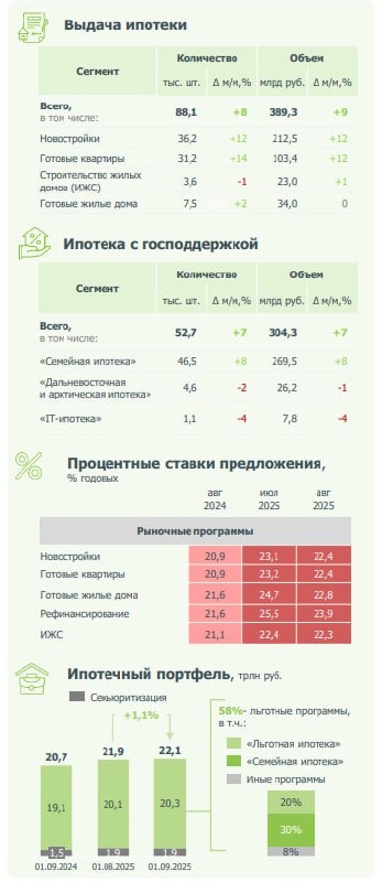📊 Итоги работы крупнейших ипотечных банков в августе 2025 года: Топ-банки выдали 88 тыс. ипотек (+8% к июлю) на 389 млрд ₽ (+9%). Впервые после окончания льготных программ выдачи выросли и по количеству (+6% г/г), и по объёму (+15% г/г). 📌 Главное в цифрах коротко: 🔁 Рост шёл и по льготным, и по рыночным продуктам: по льготам — 53 тыс. кредитов (+7%) на 304 млрд ₽ (доля в выдачах 60% по числу и 78% по объёму); рыночная ипотека — 35 тыс. (+11%) на 85 млрд ₽ (+20%) на фоне снижения ставок (около 22% к концу августа). 🏘 Спрос оживил и вторичный рынок (+14% по количеству) и новостройки (+12%). Сегмент готовых домов и ИЖС остался на уровне июля. 🔻 После снижения ключевой ставки до 17% банки начали снижать ставки: Сбер и Т-Банк снизили на ~1–2 п.п. (минимумы 17,4–17,9%), ДОМ.РФ с 23 сентября опустил ставку на новостройки на 1 п.п. (мин. 20%). 💼 Ипотечный портфель крупнейших банков в августе — 20,3 трлн ₽ (+1,1% за месяц, +2,6% с начала года). 📌 Итог за 8 мес. 2025 г.: 502 тыс. креди