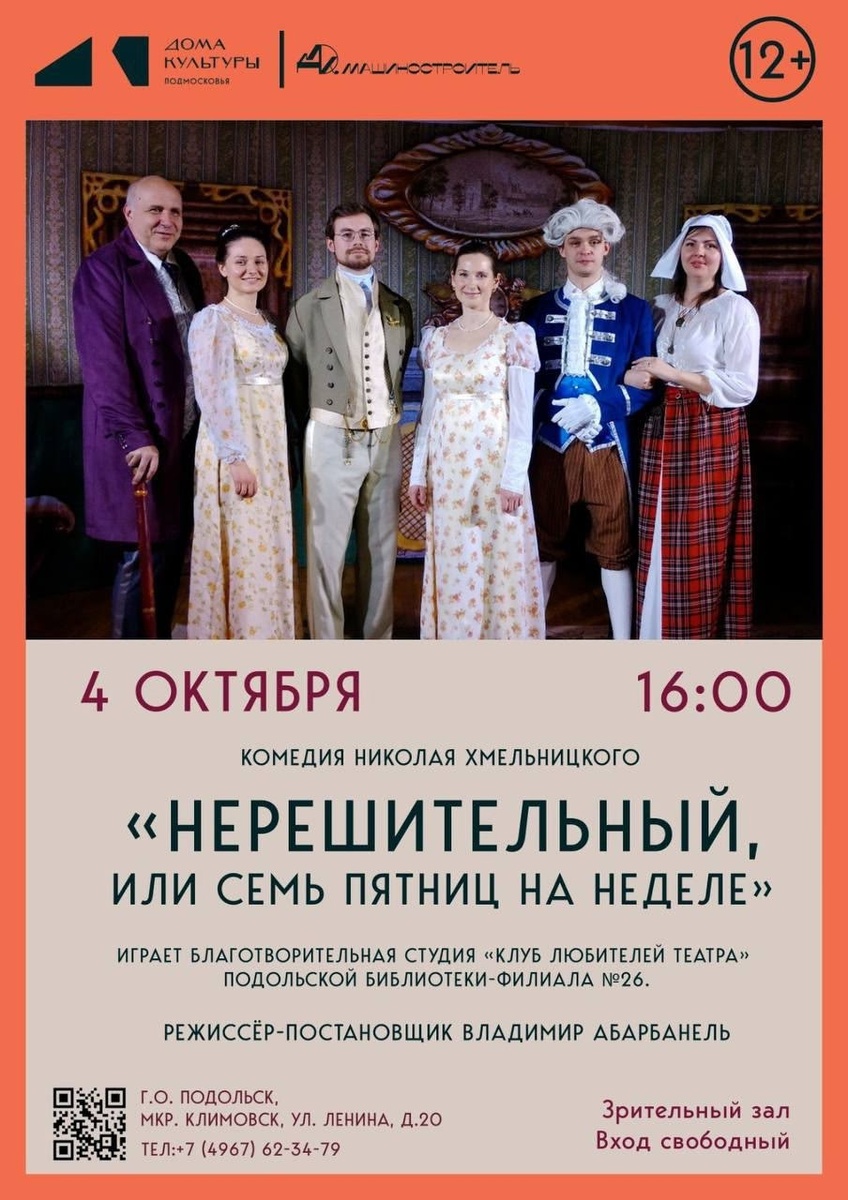 ✨ Комедия Николая Хмельницкого "Нерешительный или семь пятниц на неделе" 🎭Пьеса в жанре «благородной комедии» исполнялась около десяти лет: на профессиональных сценах, в салонах знати с участием благородных любителей-актёров и в домашних театрах дворянских семей. 🎬Постановка осуществлена благотворительной студией «Клуб любителей театра», театральный режиссёр Владимир Абарбанеля. 🚫 Возраст: 12+ 📆 04.10.2025 🕒 16:00 🏢 ДК "Машиностроитель" 📍 г.о. Подольск, мкр-Климовск, ул. Ленина, 20 💰 Вход свободный❗️ ⭐Поддержать канал голосом 💰 Вакансия - курьер в Подольске ✅ Мероприятия Подольск https://dzen.ru/id/66ed500f7b5671493eca3fd6 http://vk.com/podolsk_events http://dzen.ru/podolsk_events