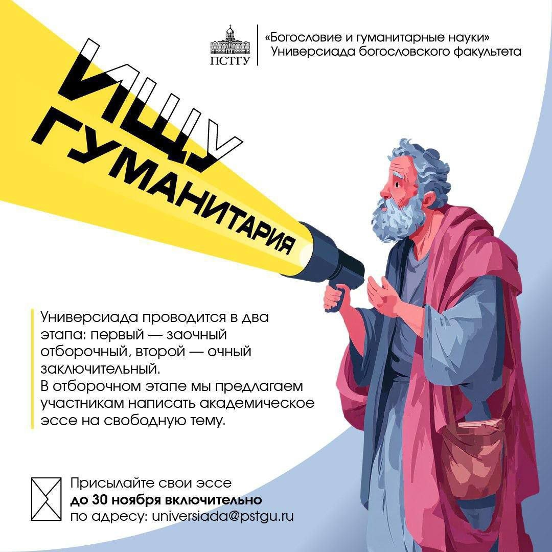 Богословский факультет ПСТГУ проводит уже третью универсиаду «Богословие и гуманитарные науки». Зовут участвовать всех студентов-гуманитариев. Я и сам поступил в ПСТГУ по этой универсиаде два года назад. И именно благодаря ей я познакомился со многими людьми, с которыми продолжаю общаться до сих пор, так что советую принимать участие в первую очередь ради сообщества и возможности расширить свой круг знакомств. Но есть и более осязаемая мотивация.