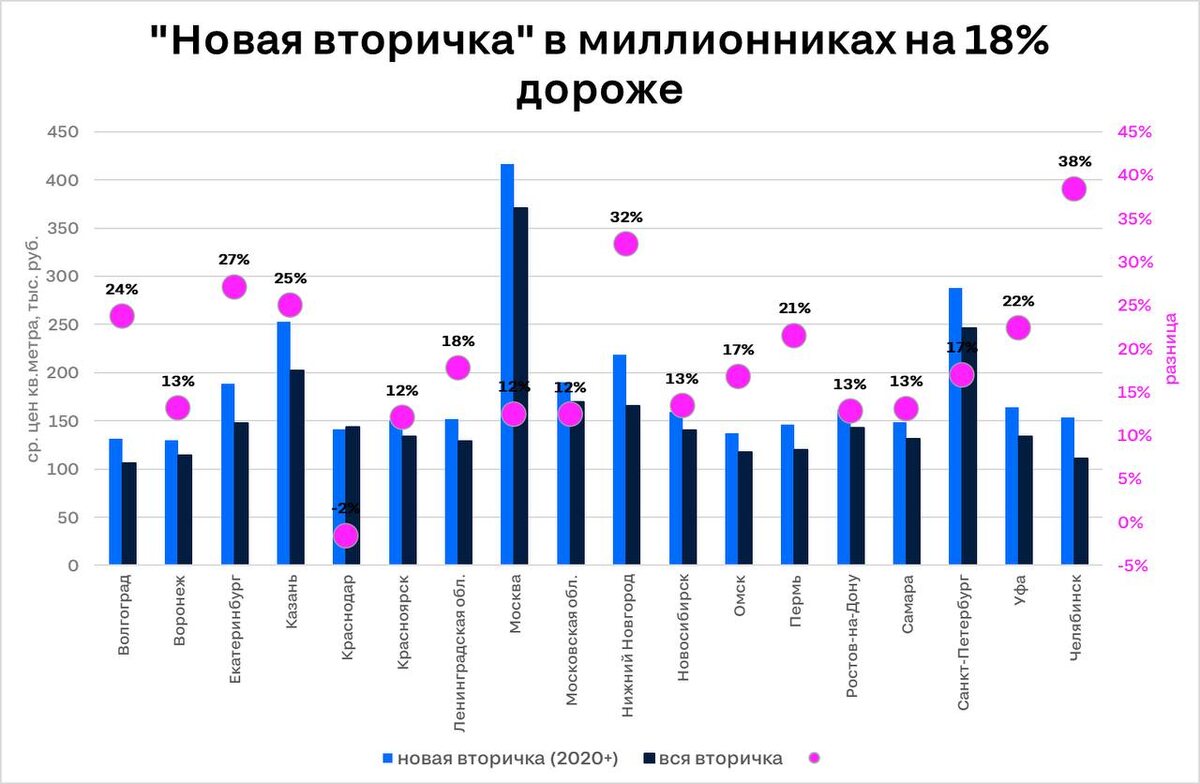 Среднюю разницу между «новой» и старой «вторичкой» в городах миллионниках оценили в 18%. Волгограде эта разница оказалась выше — 24%.