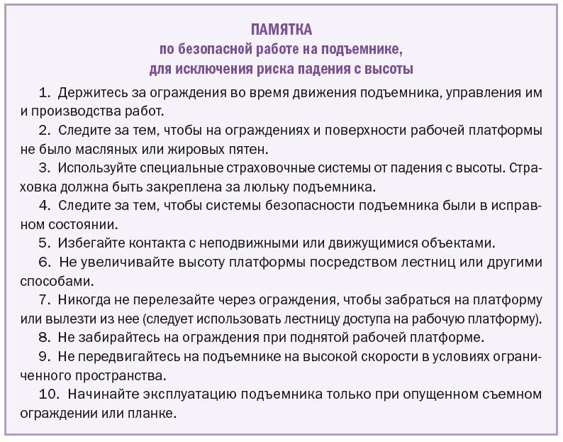 Памятка по безопасной работе на подъемнике для исключения риска падения с высоты