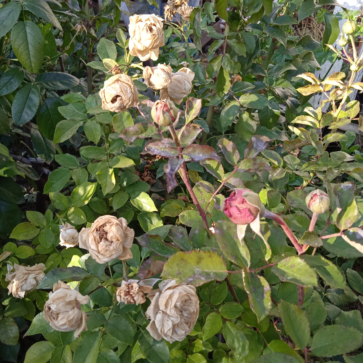 На сегодня у меня две новости, хорошая и плохая. Печальное зрелище. Такое сегодня у многих. Если вчера были цветочки, то сегодня ягодки. Никогда еще в начале октября не было такого крепкого мороза, чтобы уничтожить цветение. Кто говорит - 7, кто - 8. Сама не смотрела, мне уже пофиг. Всю мою красоту угробил. Ожидала, что будет так, как в преждние годы. Даже стойкая Ангела сдалась. Если бы не семь кустов мультифлоры, то на газон можно было бы не заходить, печальное зрелище. Из сорока кутов роз, что здесь растут, только моя красавица Жан Кокто стоит живехонька. А сзади, видите, ее защитник с сухими листьями. Но слезы не лью по этому поводу. Жизнь продолжается! Надо бы по-хорошему, обрезать все замерзшие цветы, но я продолжила начатую работу по засыпке роз. Все новые кустики засыпала в этом розарии. Хорошо, что дед земли привез. А потом решила вырезать все засохшее и отцветшее в этом цветнике. Обрезала гелениумы, они давно отцвели и стояли неопрятные. Рядом кустик волжанки и санвитали