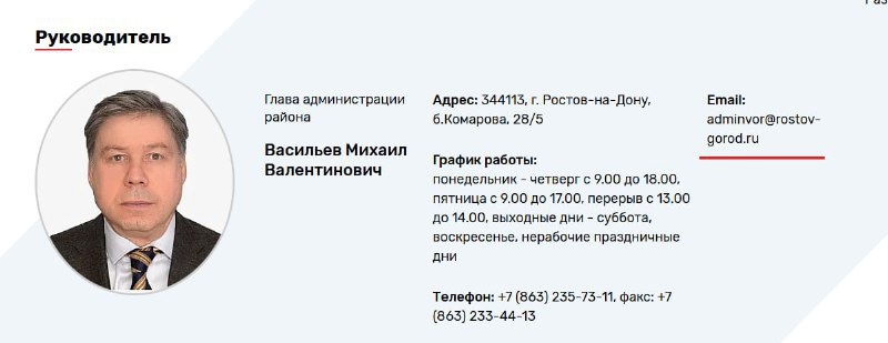 Глава администрации Ворошиловского района Ростова-на-Дону до сих пор принимает обращения жителей на почту с адресом adminvor.