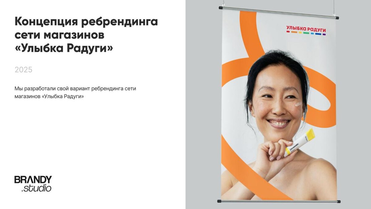Вау! Новая концепция! ✨ «Улыбка радуги» сделала ребрендинг. А мы хотим показать свою версию — как мог бы выглядеть этот бренд в новом образе. Мы предложили строгий и элегантный серый цвет для фона, чтобы создать ощущение стабильности и порядка. На нём — яркие линии. Каждая полоса = своя категория товаров, что существенно облегчает навигацию по магазину и поиски нужного товара. Так просто и стильно формируется образ бренда, который легко запоминается и дружелюбно встречает каждого покупателя. Главная идея: визит в «Улыбку радуги» — это приятная прогулка, в конце которой всегда ждут хорошее настроение и выгодные покупки. А с чем у вас ассоциируется итоговый вариант ребрендинга, который выбрала компания?