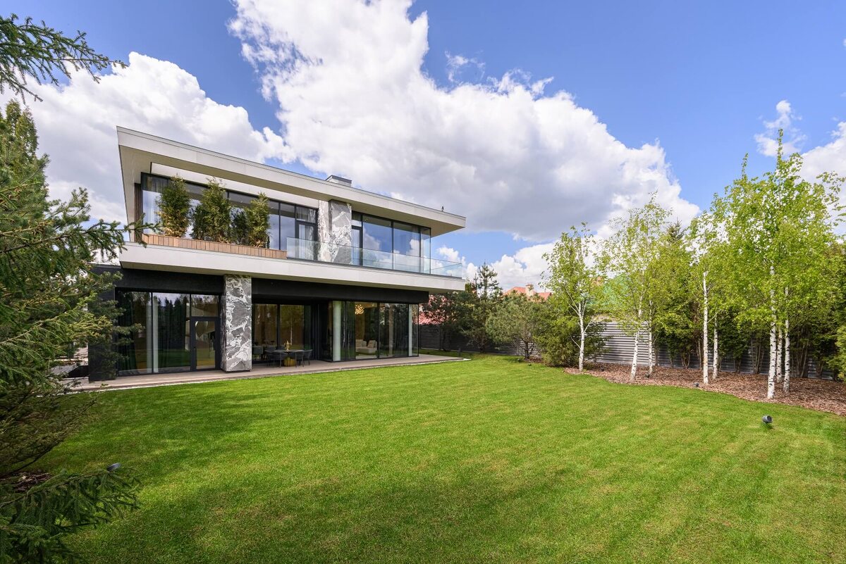 Особенности дома: высокие потолки (4,2 м на 1-ом этаже и 3,1 м на втором), лестничный атриум высотой 7,5 м, панорамные окна с закаленным стеклом толщиной 10 мм, просторная терраса с барбекю-зоной, лифт, озелененные террасы с крупномерами и автополивом на 2-ом уровне. Возможно увеличение участка за счет смежных.