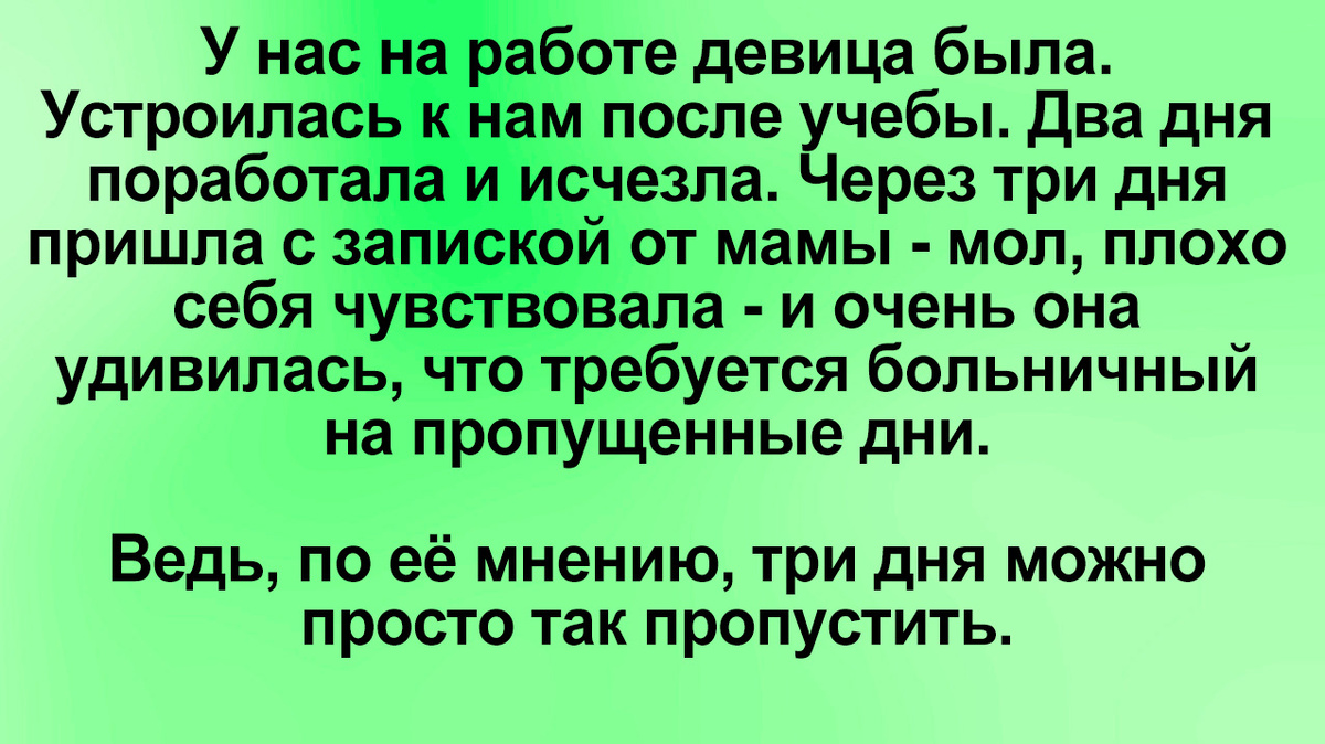 Пришла к нам на работу дева, Повар, со стажем. Готовим в школе детям, привезли товар, а у нас перемена, я говорю ты на раздаче остаешься, я товар принимать ( я старшая), всё хорошо товар приняла, перемена закончилась, а дева говорит я домой пошла, а у нас ещё вторая смена, мы думали она пошутила, нет , ушла. Без объяснений