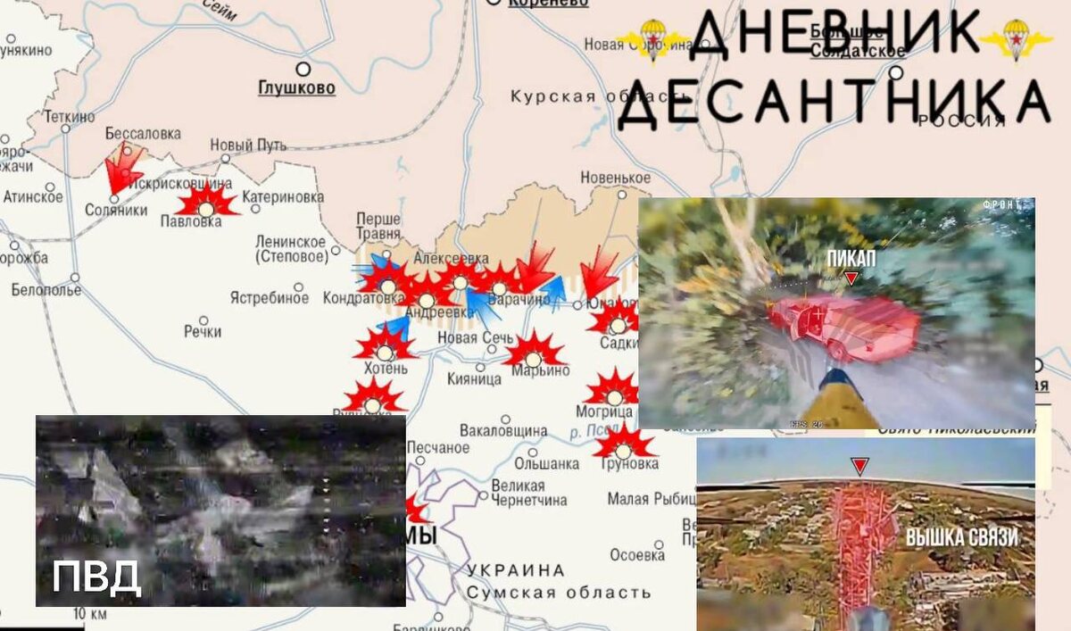 🪂 Сумское направление. Идут преимущественно позиционные бои, противник ни на одном из участков прорыва не совершает, есть зафиксированные небольшие контратаки малыми группами. ▫️В районе Юнаковки идёт зачистка лесопосадок южнее населенного пункта и западнее в направлении Храповщины. ▫️В районе Кондратовки идёт контрбатарейная борьба по позициям ВСУ в самом селе и на южных окраинах, где ВСУ закрепились и держат оборону. ▫️В районе Алексеевки ситуация без изменений: наносим удары по позициям ВСУ в Андреевке и Малой Корчаковке, а также близлежащих лесопосадках. ▫️ Дневник Десантника