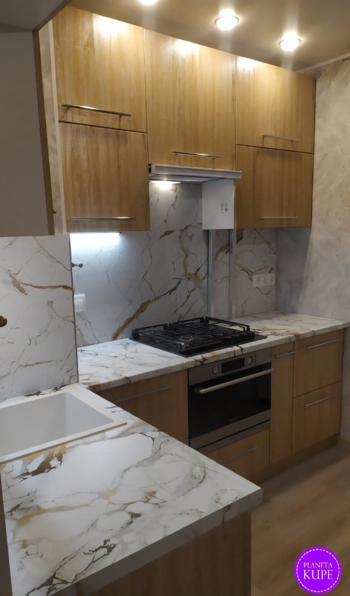 Элегантное сочетание жемчужной лиственницы и золотого мрамора сделал кухню стильной и уютной!