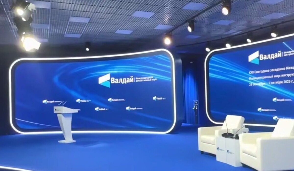 Президент РФ Владимир Путин выступает на конференции клуба «Валдай». СМИ опубликовали видео со сценой, на которой ожидается выступление главы страны перед участниками ежегодной конференции «Валдая».