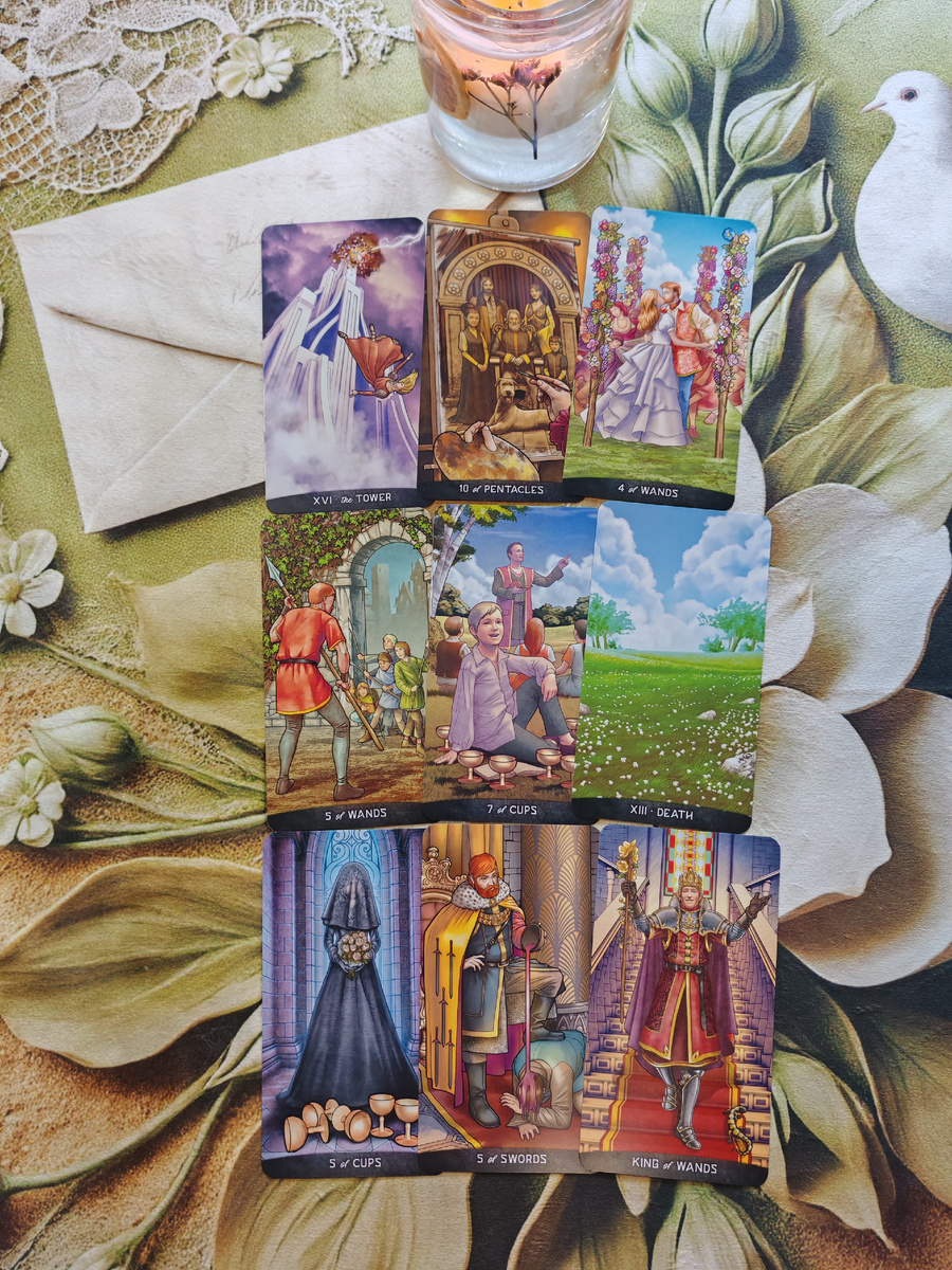 Мужчина, который в данный момент переживает крушение всех своих надежд и планов. Была в его жизни семья и дом полная чаша, но слишком загордился тем, что имел, перестал ценить свой семейный очаг, своё благополучие. Сейчас он в процессе падения, пока ещё цепляется за призрачные надежды вернуть всё, как было, вспоминает то, что потерял. Ему ещё предстоит решить все спорные ситуации из своего прошлого, выйти из мира иллюзий, в котором он застрял слишком глубоко. Тут ощущение, что он вообще потерял в своё время связь с реальностью, и это его и погубило. Ему ещё предстоит открыть глаза на своё прошлое, на свою жизнь, на свою роль в собственном падении, понять, что он сделал не так. Его ждёт трансформация и рождение заново. Впереди у него ещё падение на самое дно, депрессия, возможно алкоголь, унижения и бедность. Скорее всего, предстоит судебное разбирательство, и его он не выиграет. Тяжёлое прощание с прошлым. Но он встанет на ноги. Он выходит как Король Жезлов, а значит он ещё захочет