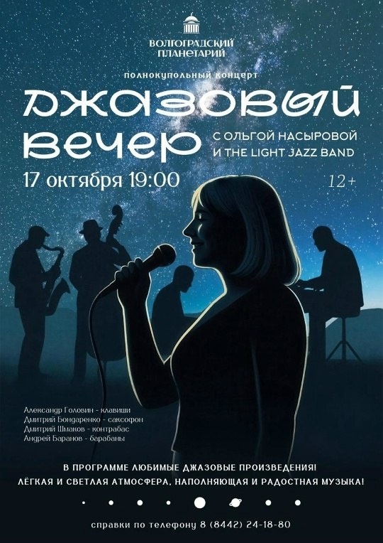 .......................................... ДЖАЗОВЫЙ ВЕЧЕР #КонцертВпланетарии .......................................... ⠀ ⠀ Осень — идеальное время для джаза! ⠀ Волгоградский планетарий приглашает на "Джазовый вечер с Ольгой Насыровой и The Light Jazz Band", где под звёздным куполом прозвучат любимые джазовые произведения в исполнении виртуозных музыкантов. ⠀ В программе вечера: 🔴 Бархатный вокал Ольги Насыровой — лауреата международных конкурсов, призёра «Jazz birds-2024»; 🔴 Импровизации The Light Jazz Band в составе: 🔴 Александр Головин (клавиши), 🔴 Дмитрий Бондаренко (саксофон), 🔴 Дмитрий Шмаков (контрабас), 🔴 Андрей Баранов (барабаны). ⠀ Гостей ждут чарующие мелодии, лёгкая и радостная атмосфера, а также неповторимое сочетание саксофона, клавиш, контрабаса и ударных. ⠀ Погрузитесь в осеннее настроение под звёздным небом планетария! ⠀ ⠀ ⠀ 🔥🔥🔥🔥 ➡️ 17 октября 19:00 ➡️ 800 рублей ➡️ Купить билет ➡️ 8 (8442) 24-18-80 ⠀ ⠀ 🚀 Космос ближе, чем кажется - ПОДПИСАТЬСЯ - Волгоград