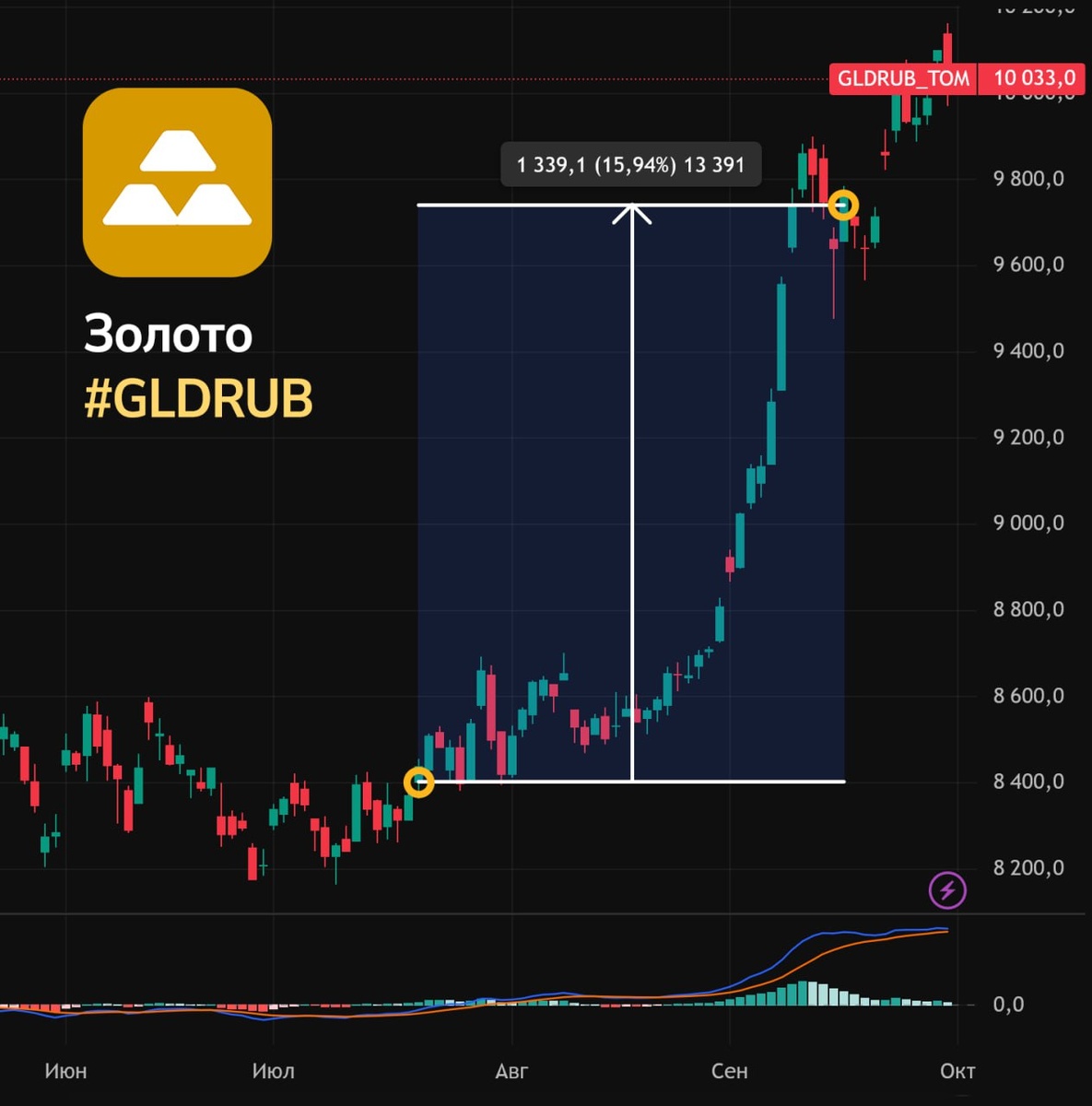 Золото в рублях #GLDRUBF купили чуть заранее сразу на выходе из консолидации нескольких месяцев, т.к. был заготовленный сценарий.