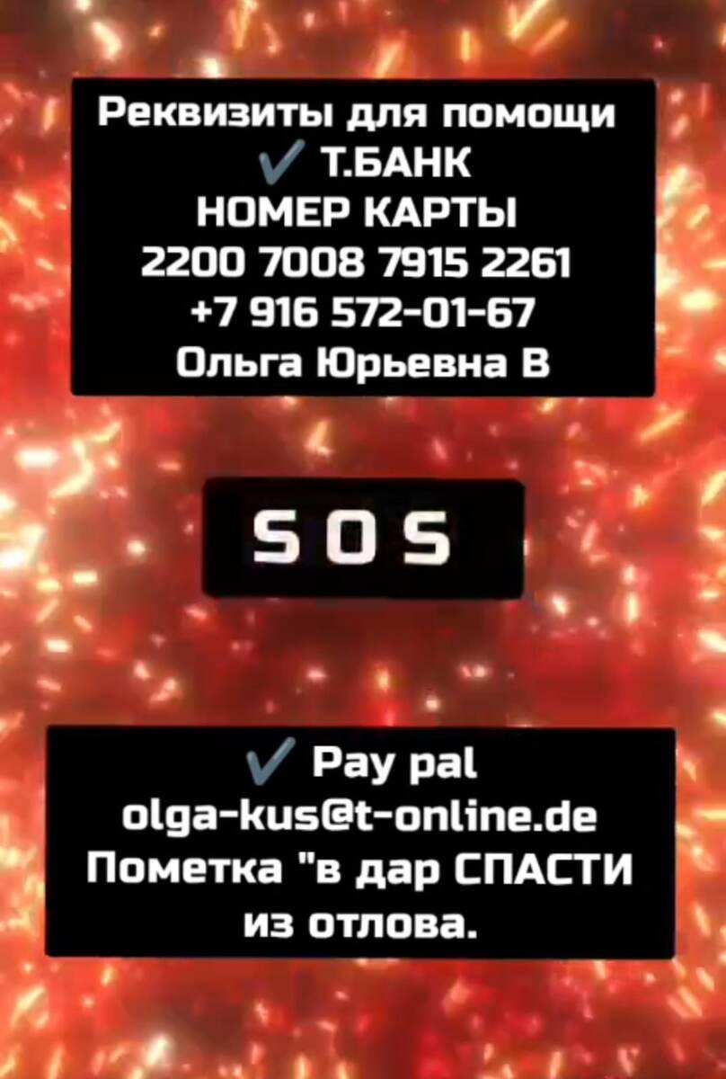 🆘🆘🆘 Казахстан: СНОВА ОТЛОВ! Нужна срочная помощь! 🆘🆘🆘 Дорогие друзья! Только начался октябрь, и снова эта ужасная новость: в Казахстане опять начался массовый отлов животных! Мы только-только успели вывезти кошек в безопасное место, как пришло сообщение о полном отлове! ⚠️У нас катастрофически мало времени! Есть информация о раненых собаках: раны на шее, на лапах… Им срочно нужна помощь! 🔥Нам нужно собрать средства, чтобы оплатить: 🆘"Зоотакси" (срочная транспортировка животных в безопасное место) Передержку Обработку для щенков (их там очень много!) Каждая минута дорога! Пожалуйста, не оставайтесь равнодушными! 🙏 🙏Просим вашей помощи! Любая сумма спасет жизнь! Любая ваша помощь – это шанс на спасение! Пожалуйста, не оставайтесь в стороне! ✅Реквизиты для помощи ✔️ Т.БАНК НОМЕР КАРТЫ 2200 7008 7915 2261 +7 916 572-01-67 Ольга Юрьевна В ✔️ Pay pal olga-kus@t-online.de Пометка "в дар спасти из отлова " ✔️ Друзья, если Вам удобнее помочь на реквизиты Казахстана - пож