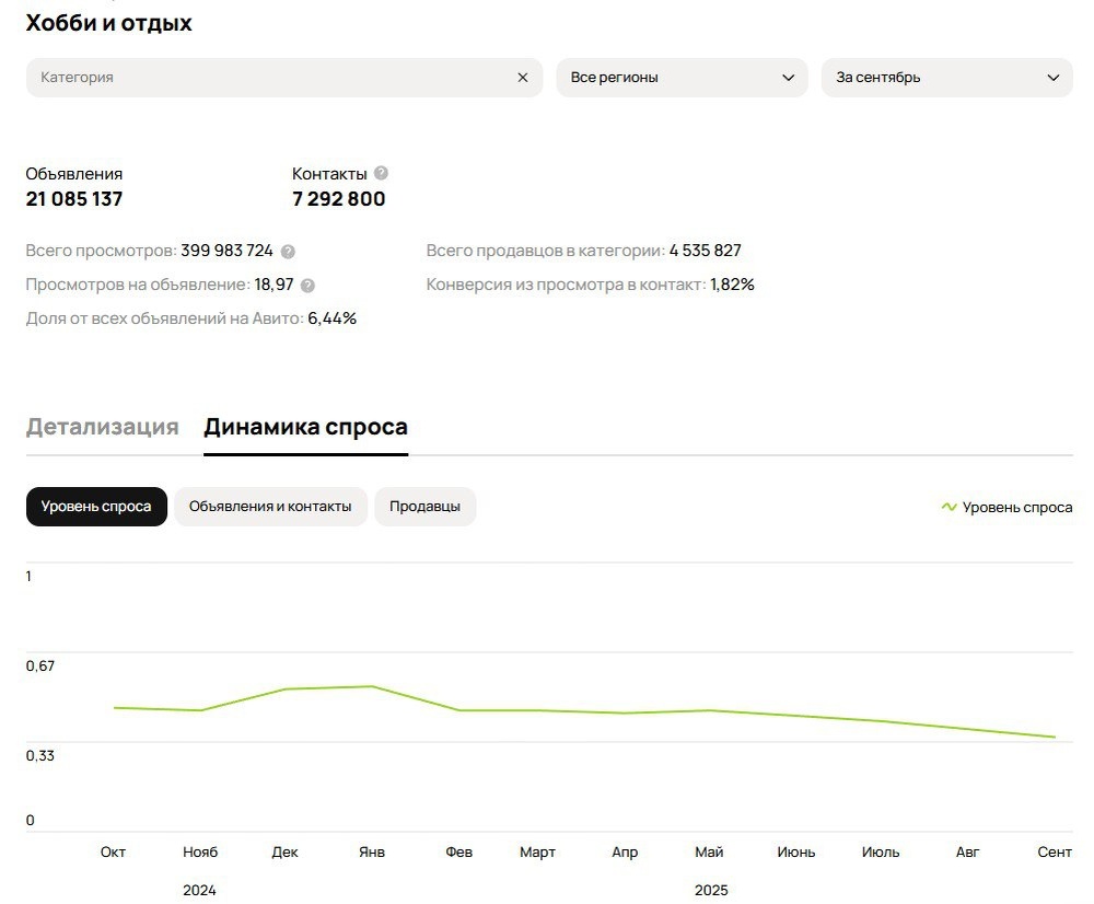 В Хобби и отдыхе снижение спроса, которое спровоцировано падением интереса на Билеты и путешествия с началом осени