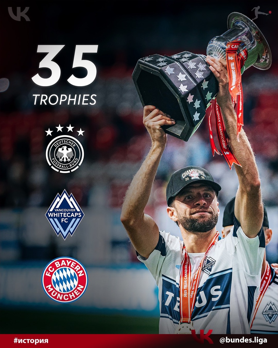 🔥🔥🔥 Мюллер стал самым титулованным футболистом Германии, выиграв 35-й трофей 🏆 «Ванкувер Уайткэпс» победил в финале первенства Канады по футболу. Для Мюллера этот трофей стал 35-м в карьере, он опередил по их количеству Тони Крооса, который выиграл 34 титула. 🚀 Томас Мюллер — рекордсмен «Баварии» по количеству сыгранных матчей и третий бомбардир в истории клуба. Он является 13-кратным победителем Бундеслиги, шестикратным обладателем Кубка Германии, а также двукратным победителем Лиги чемпионов УЕФА (2012/13, 2019/20) в составе «Баварии». В сезоне 2012/2013 стал самым ценным игроком чемпионата Германии 🇩🇪 🏆 Это Бундеслига, брат! #Бундеслига