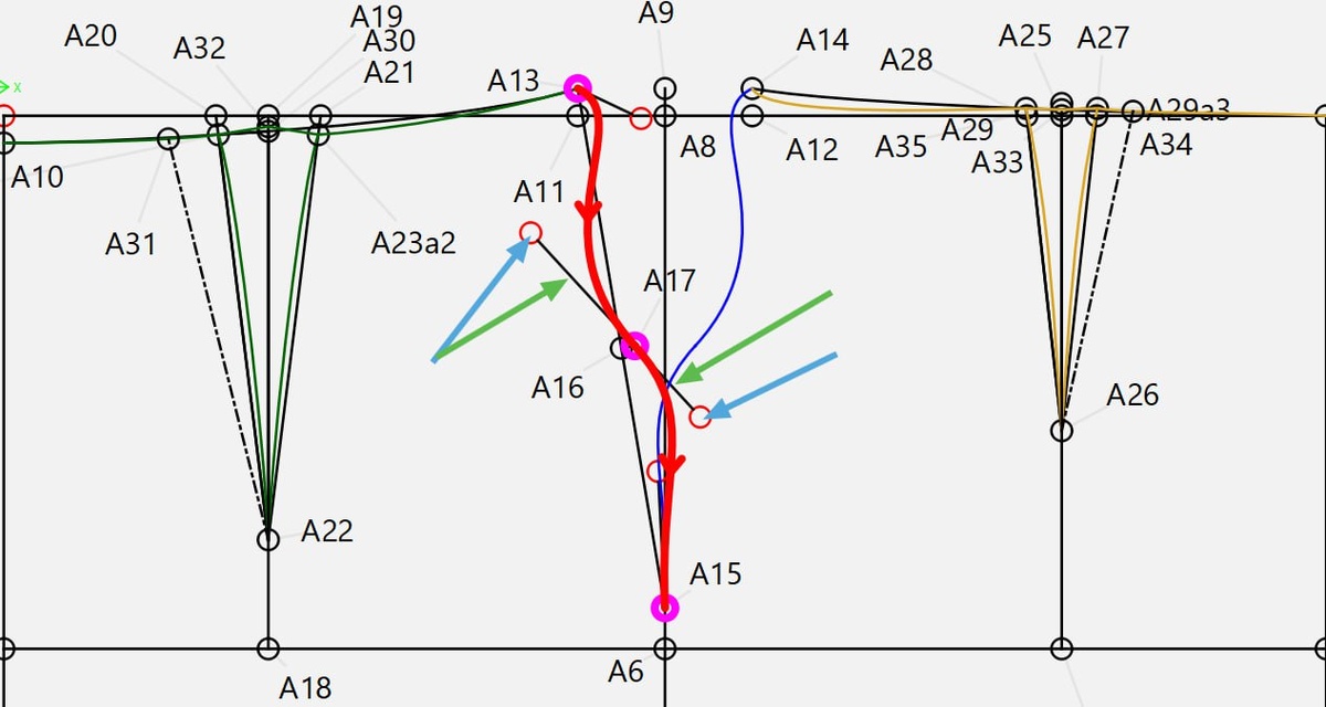 Теперь, когда мы знаем что такое сегменты кривой, давайте разбираться как сделать прямые углы. Напоминаю, нам необходимо создать прямой угол между кривой А13А15 ( боковая лини и А23а2А13( линия талии после вытачки).